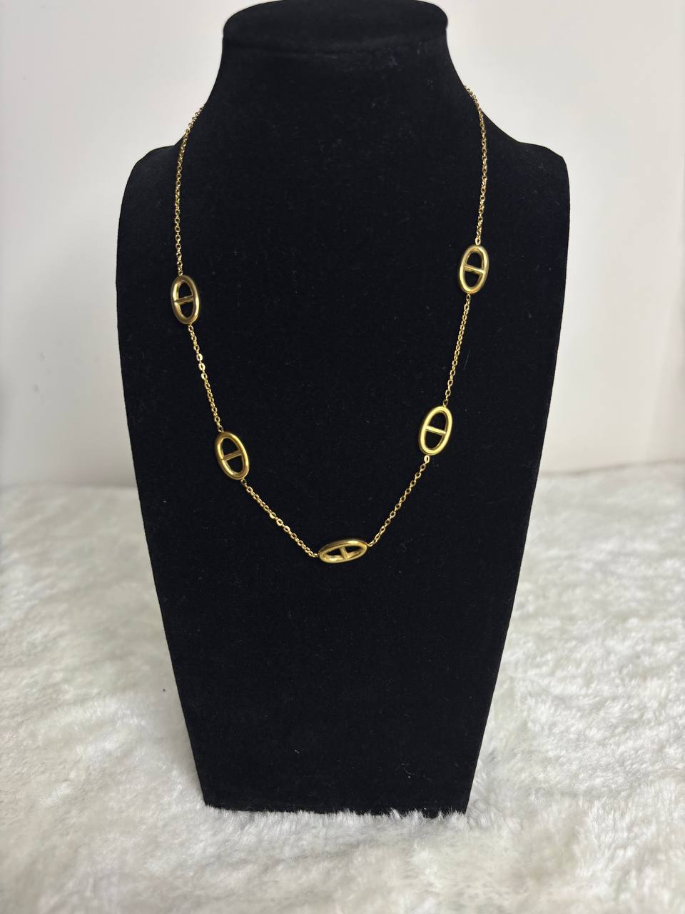 Un design épuré et intemporel : des maillons ovales dorés finement reliés sur une chaîne élégante. Ce collier minimaliste se distingue par sa sobriété luxueuse, incarnant la puissance tranquille du style royal. Il sublime les tenues quotidiennes avec une touche d’élégance subtile.
